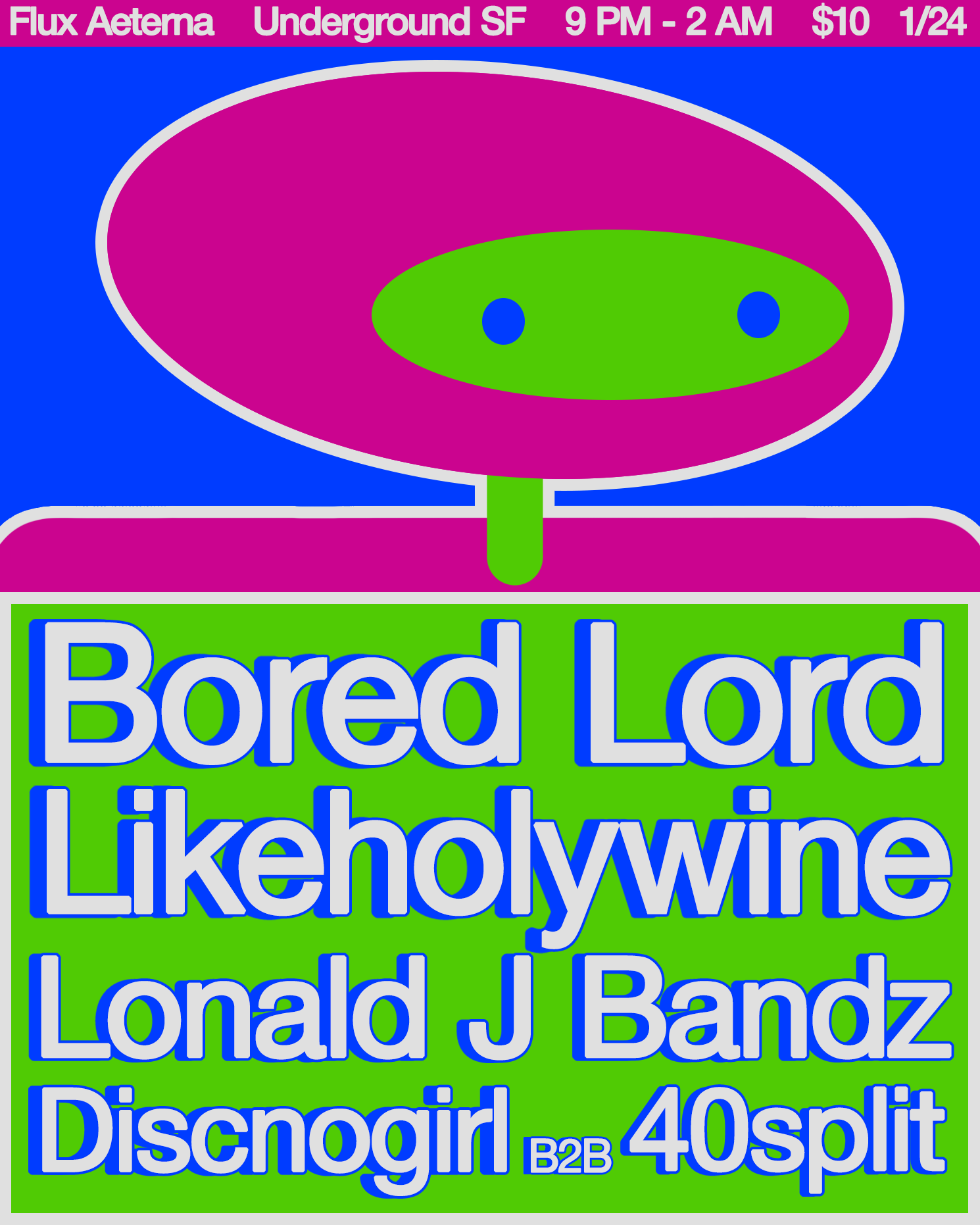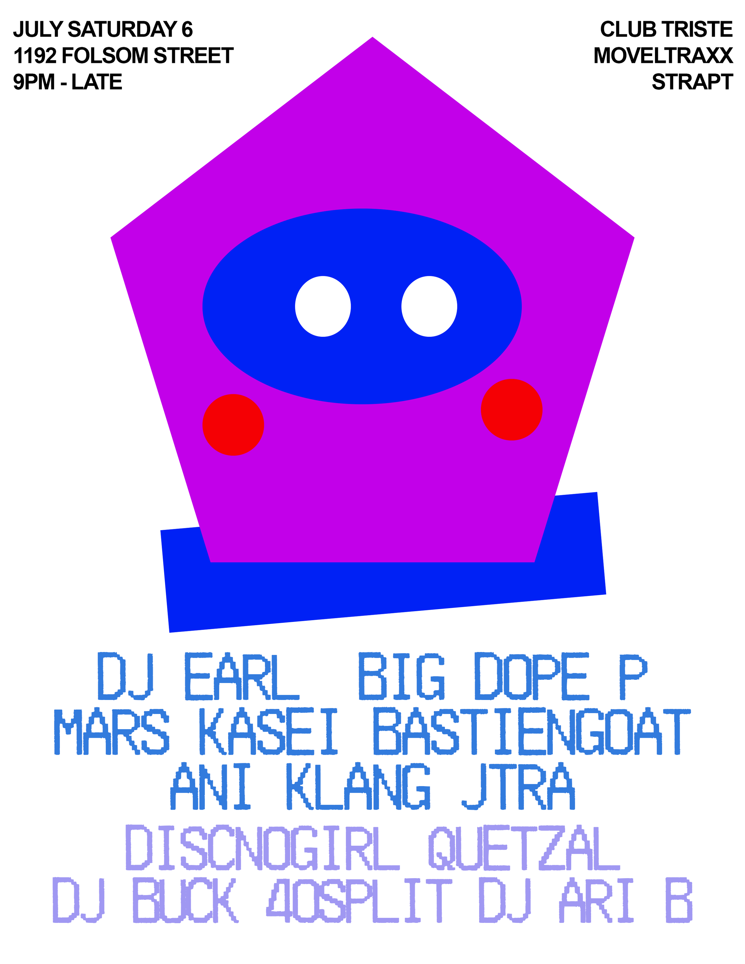 While outsourcing inspiration for this flyer, I reminisced on my strategies for producing new designs, what stuck and what didn’t. I thought back to a flyer I created for Strapt the year before (Pictured above). For that flyer, I started by drawing a face, taking a picture of it, putting it to photoshop, then recreating it by tracing over it—only using stock shapes. Since that character was so bright & colorful, I decided to keep the rest of the flyer simple, in order to make the character the focal point of the design. I wanted to flip this idea on its head with the following design (Pictured to the left), by creating a character in the same method but instead producing a vibrant color scheme for the rest of the flyer as well. I played with the dimensions of this charcter, making it look as though the characters head is at an angle, looking to the right. As well as that, I used a light grey outline to accentuate the bright colors.
