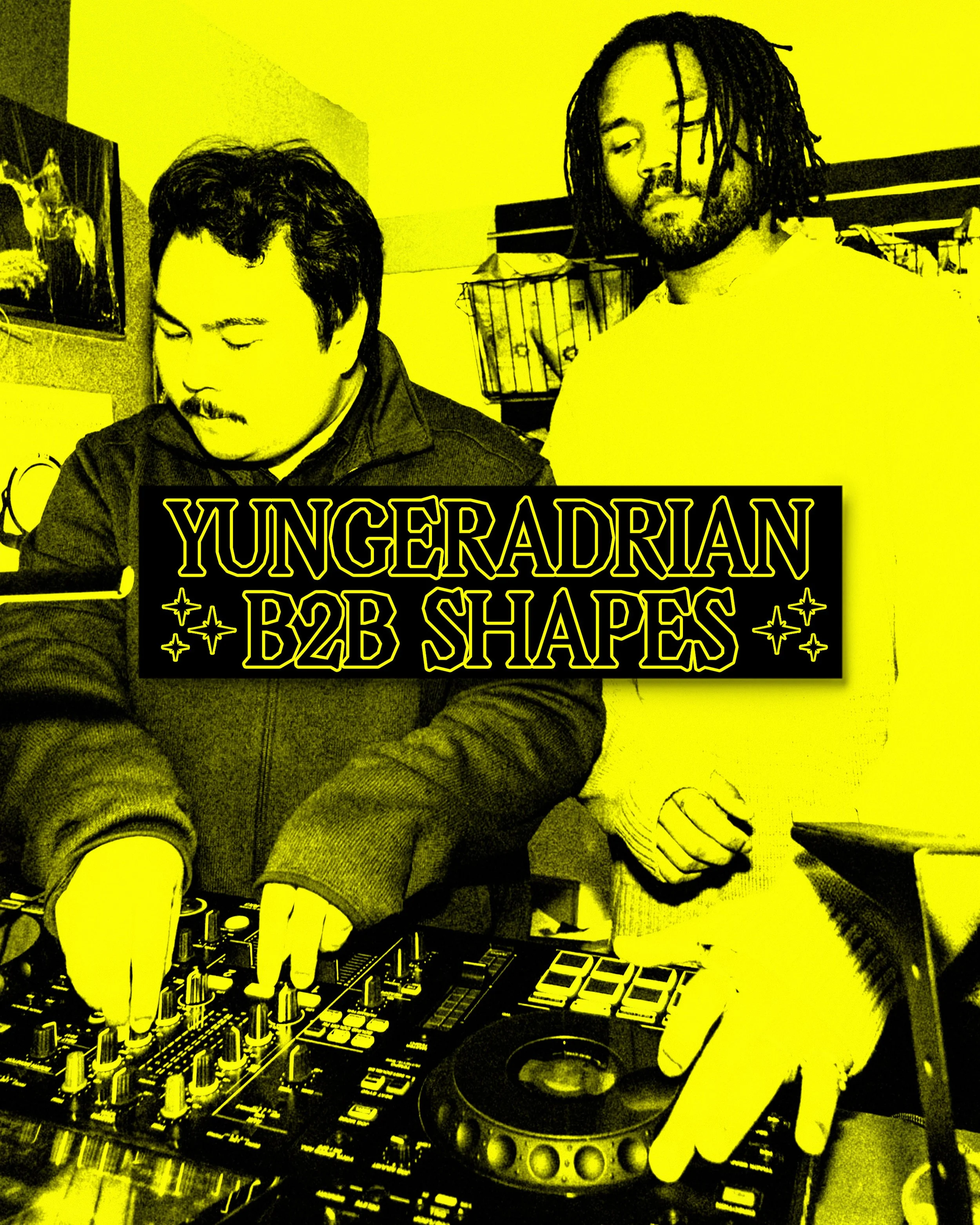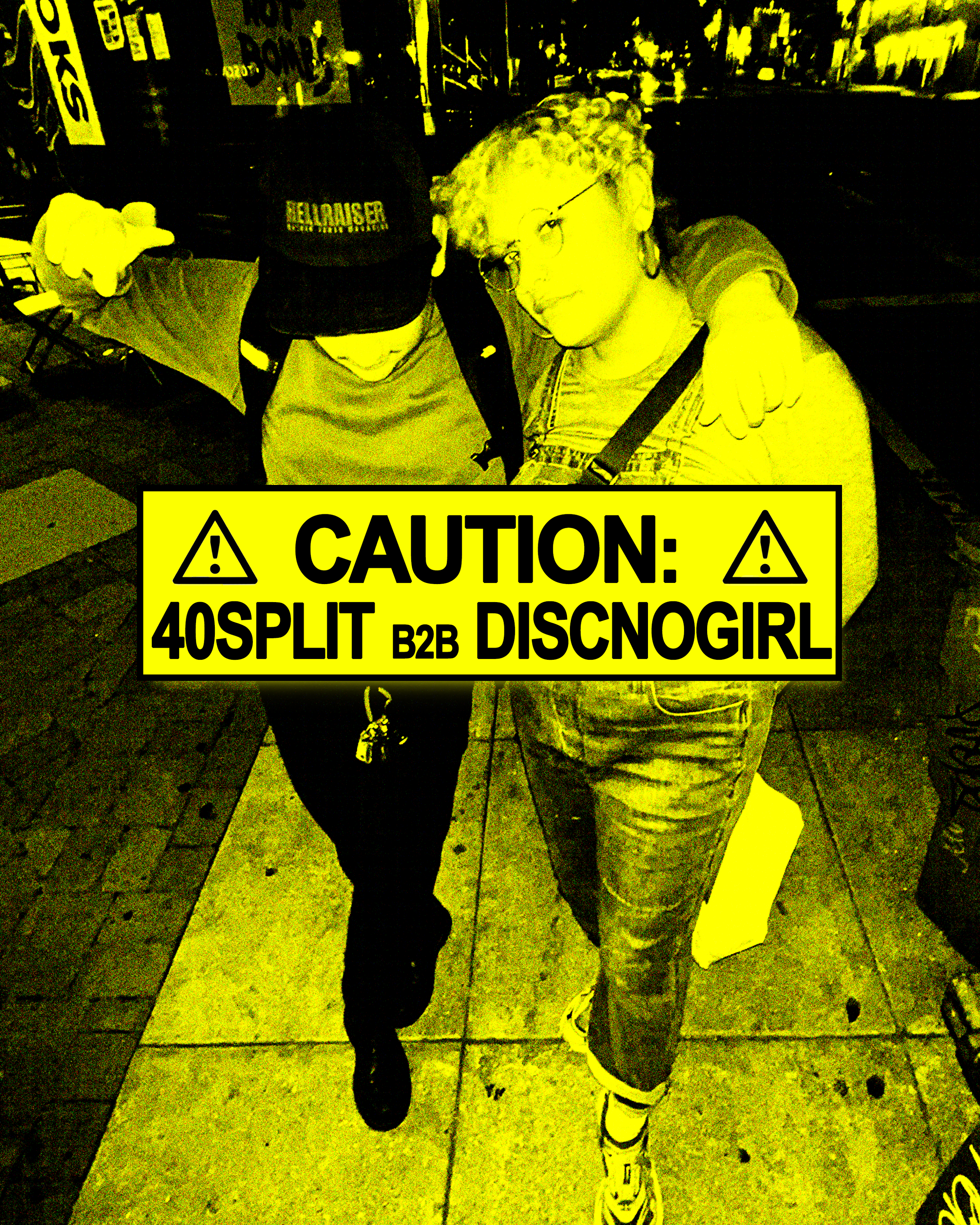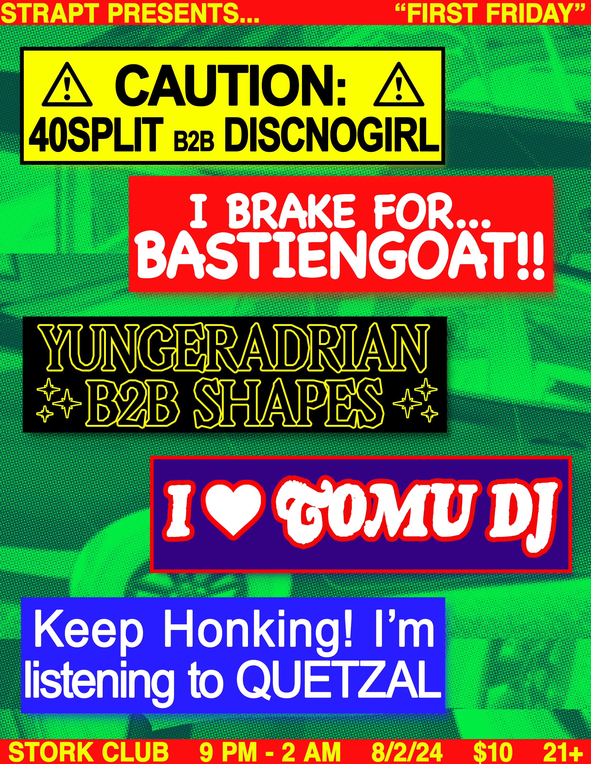 Admittedly had an incredible amount of fun with this one. Took a picture of my roommate’s car, duplicated it, and overlayed each image several times. After doing so, I added a light green & black gradient, giving it a night vision esque color scheme. I created fictional bumper stickers over this graphic, as well as making individual promotional graphics for each act, featuring the bumper stickers.