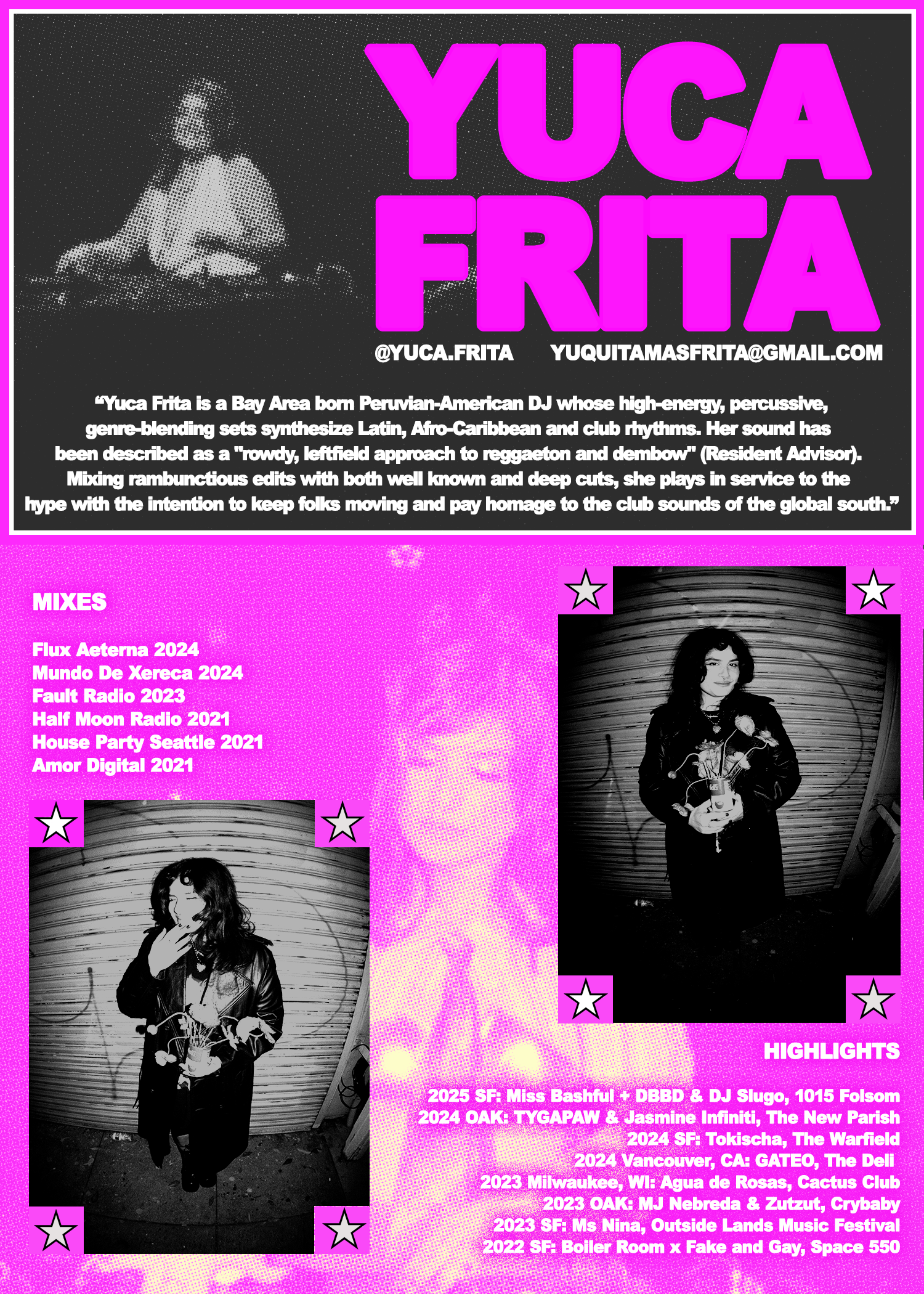 Commisioned to create digital EPK for local DJ Yuca Frita. When contacted, she sent me graphics that inspired her (fun fact: sent me one of my own designs as inspiration, not knowing i made it!) She gave me a few ideas and otherwise told me to work my magic. Used selected photos from the press kit she sent me, as well as her write ups & list of notable mixes/shows. I had in mind a half & half theme for this flyer, and expirimented with ways to incorporate this into the design. I decided to balance bright pinks & whites with greys and utilized most pictures sent to me in the design.